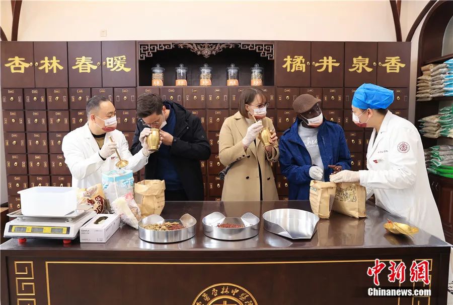 來自比利時、白俄羅斯和加納的外國友人在山東(dong) 東(dong) 營一家中醫醫院的中藥房識別、稱量中藥材。周廣學 攝