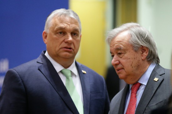 3月23日,在比利時布魯塞爾的歐盟總部,聯合國秘書(shu) 長古特雷斯(右)與(yu) 匈牙利總理歐爾班在歐盟峰會(hui) 開始前交談。(新華社記者鄭煥鬆攝)