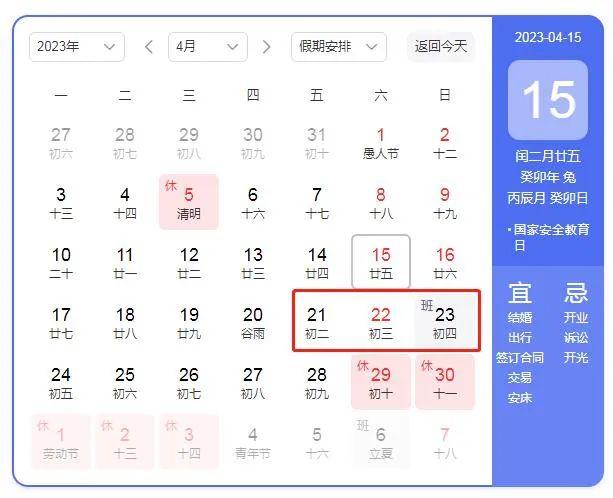 4月21日至23日放假調休,共3天