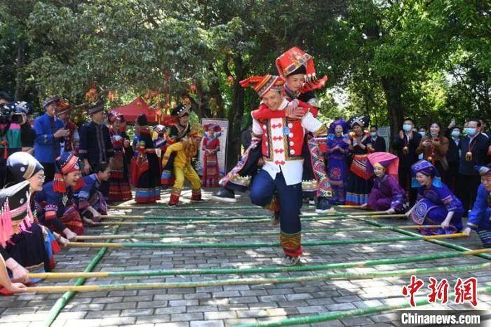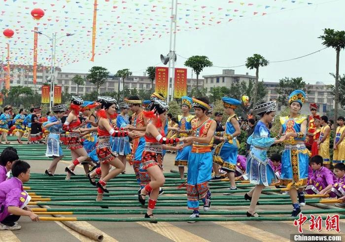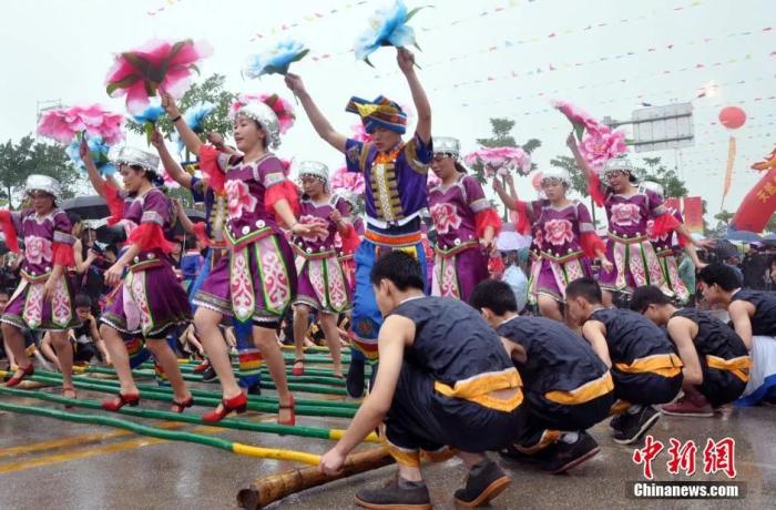 壯族民眾(zhong) 著盛裝歡跳竹竿舞。黃豔梅 攝