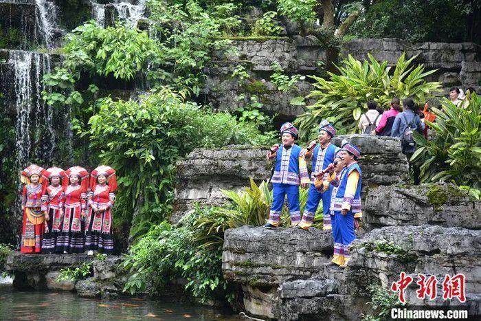 歌手在南寧市武鳴區靈水湖畔唱山歌迎客。黃豔梅 攝