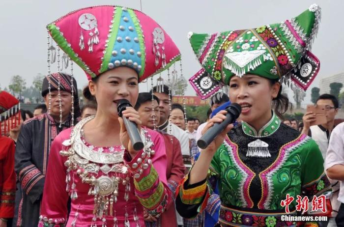 壯族民眾(zhong) 身著民族服飾賽山歌。黃豔梅 攝