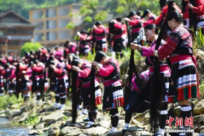 龍勝各族自治縣龍脊鎮黃洛瑤寨舉(ju) 辦“長發節”,長發梳妝展示。潘誌祥 攝