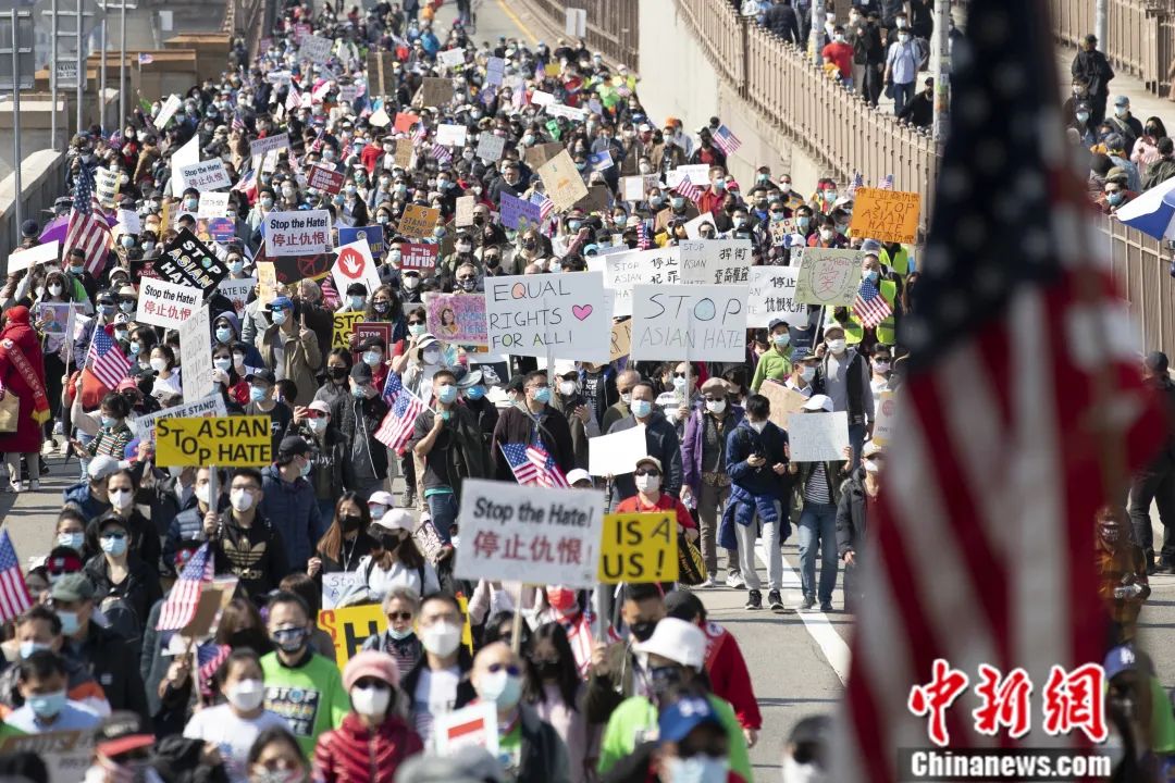 2021年,美國亞(ya) 裔民眾(zhong) 受到種族歧視侵害事件頻發,針對亞(ya) 裔的仇恨犯罪備受社會(hui) 關(guan) 注。圖為(wei) 2021年4月,紐約舉(ju) 行反仇恨亞(ya) 裔大遊行。廖攀 攝