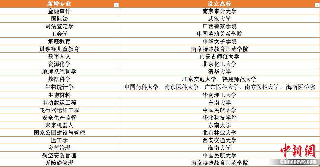 觀察可以看到,很多新專(zhuan) 業(ye) 都是高校結合自身特色及社會(hui) 需求所設立的,比如南京特殊教育師範學院新設立的孤獨症兒(er) 童教育、無障礙管理專(zhuan) 業(ye) ,中國勞動關(guan) 係學院新設立的工會(hui) 學,中國民航大學新設立的飛行器運維工程、航空安防管理專(zhuan) 業(ye) ,東(dong) 南大學新設立的未來機器人專(zhuan) 業(ye) ,中華女子學院新設立的家庭教育專(zhuan) 業(ye) ,廣西警察學院新設立的司法鑒定學專(zhuan) 業(ye) 等等。