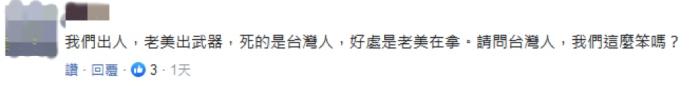 “我們(men) 出人,老美出武器,死的是台灣人,好處是老美在拿。請問台灣人,我們(men) 這麽(me) 笨嗎?”