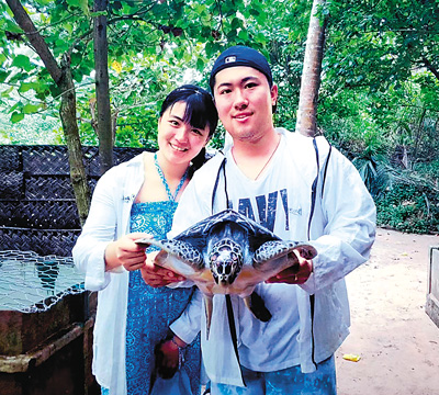 2018年,許振軒與(yu) 李丹宜正在江蘇南京讀大學。一次偶然的機會(hui) ,兩(liang) 人到斯裏蘭(lan) 卡體(ti) 驗了一場特殊的“海龜保育義(yi) 工之旅”。許振軒一直非常喜歡去海洋館,宿舍還有好幾個(ge) 烏(wu) 龜蛋。“看著它們(men) 從(cong) 孵化到慢慢成長,感覺非常奇妙。剛好一直關(guan) 注的公眾(zhong) 號提供了研學機會(hui) ,我從(cong) 眾(zhong) 多項目裏選擇了‘海龜保育’。”許振軒的決(jue) 定也影響了喜愛小動物的女朋友李丹宜。