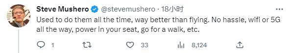 曾在中國工作多年的企業(ye) 家Steve Mushero也留言說,“我以前一直坐高鐵,比坐飛機好多了。不麻煩,一直有wifi或5G,你的座位上有電源,還可以散散步等。”