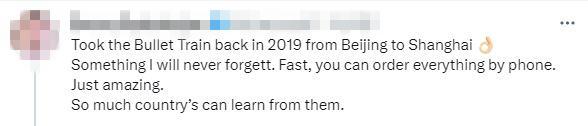 還有網友說,“2019年坐高鐵從(cong) 北京到上海。一些事我永遠不會(hui) 忘記。速度很快。太棒了。很多國家可以向他們(men) 學習(xi) 。”