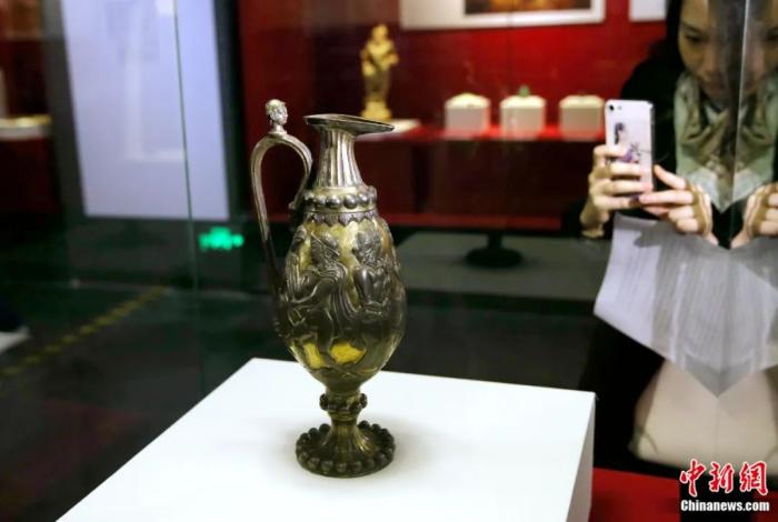 民眾(zhong) 在西安陝西曆史博物館參觀展出的波斯薩珊王朝胡瓶。張遠 攝