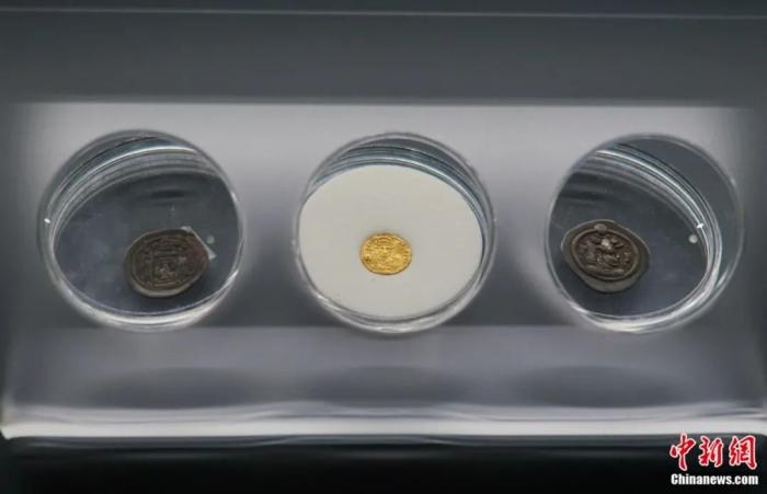 青海省博物館藏、南北朝時期的波斯薩珊朝銀幣(兩(liang) 側(ce) 西寧隍廟街出土)和羅馬金幣(中 都蘭(lan) 縣香日德出土)。中新社記者 馬銘言 攝