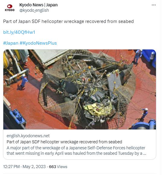 據報道,潛水員此前在伊良部島以北6公裏海域106米深處,發現了失聯直升機主體(ti) 部分。5月2日,該部分被打撈網撈出水麵。
