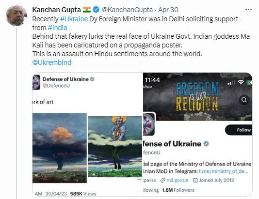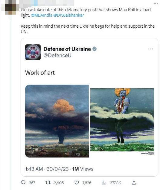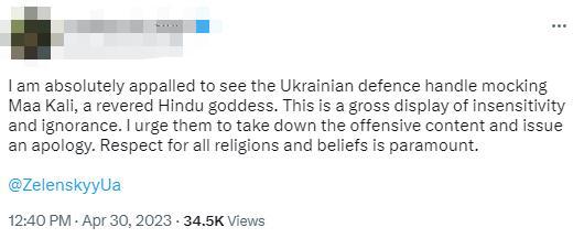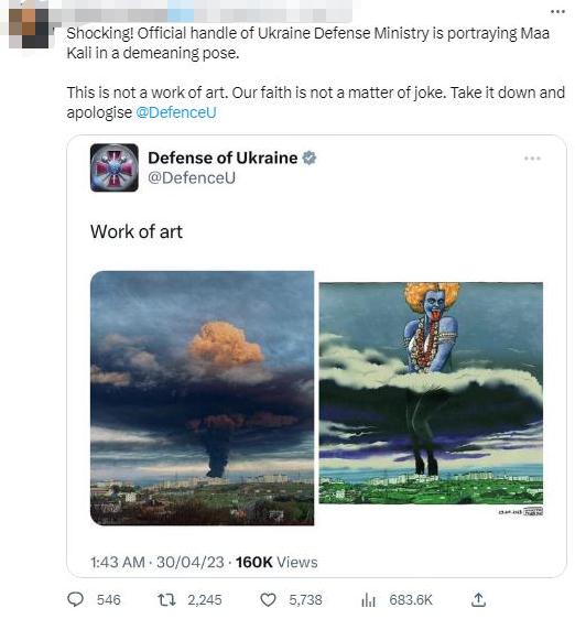 《印度斯坦時報》稱,這張圖被認為(wei) 醜(chou) 化了印度教女神,是“對印度教的不尊重”,推文“遭到強烈反對”“傷(shang) 害了印度人的感情”。甚至有印度網友呼籲印度官方幹預此事。目前,烏(wu) 克蘭(lan) 國防部已經刪除該推文。