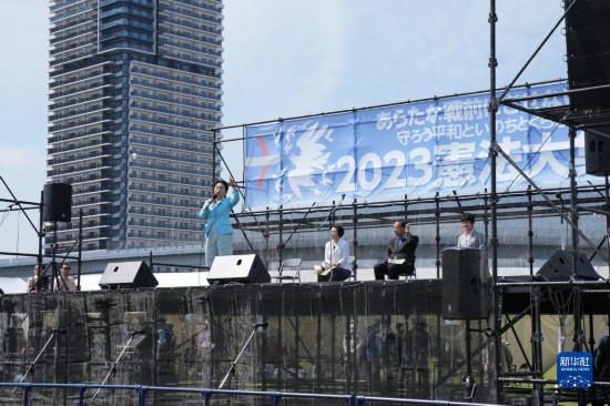 5月3日,在日本東(dong) 京有明防災公園的廣場上,在野黨(dang) 社民黨(dang) 黨(dang) 首福島瑞穗在集會(hui) 上發表演講。新華社記者 張笑宇 攝
