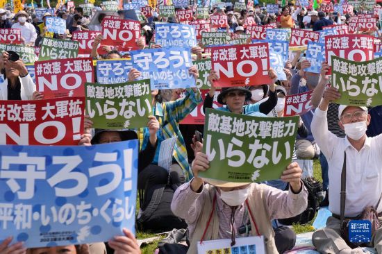 5月3日是日本憲法紀念日。當天,約2.5萬(wan) 名日本民眾(zhong) 聚集在東(dong) 京有明防災公園的廣場上,舉(ju) 行了守護憲法集會(hui) ,他們(men) 打出守護憲法、反對強軍(jun) 擴武、不要反擊能力、反對修改憲法等內(nei) 容的標語和旗幟,呼籲守護憲法、守護和平。