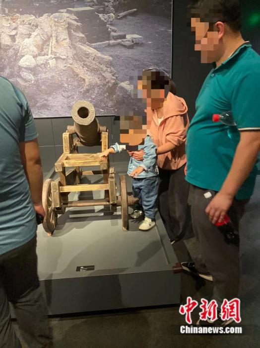 該展區展示的是明清時期火器等主力兵器,有禁止觸摸標識,但由於(yu) 部分展品未設置圍欄,遊客隨手可以觸碰到藏品,甚至有家長抱著孩子與(yu) 藏品“親(qin) 密接觸”。此外,現場還有遊客大聲喧嘩的情況。