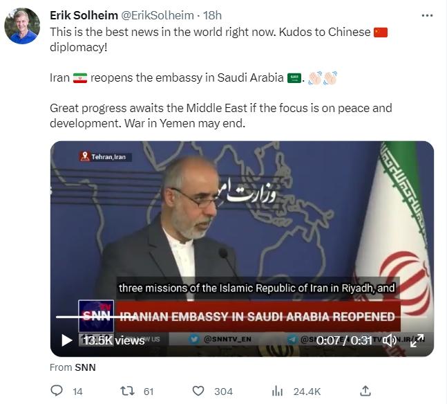 索爾海姆配文提到“伊朗重新開放駐沙特阿拉伯大使館”。他表示,“這是目前世界上最好的消息。為(wei) 中國外交點讚!”