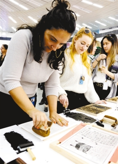 參觀者在體(ti) 驗中國傳(chuan) 統拓印。
