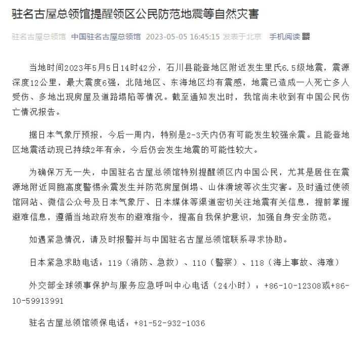 中新網5月5日電 據中國駐名古屋總領館消息,當地時間2023年5月5日14時42分,石川縣能登地區附近發生裏氏6.5級地震,震源深度12公裏,最大震度6強,北陸地區、東(dong) 海地區均有震感,地震已造成一人死亡多人受傷(shang) 、多地出現房屋及道路塌陷等情況。截至通知發出時,我館尚未收到有中國公民傷(shang) 亡情況報告。