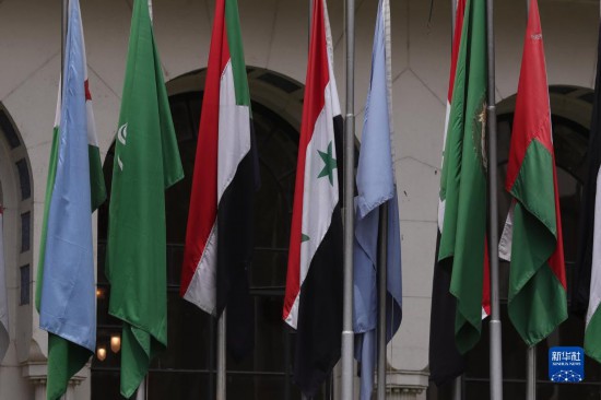 這是5月7日在位於(yu) 埃及開羅的阿拉伯國家聯盟總部拍攝的敘利亞(ya) 國旗(左四)。新華社發(艾哈邁德·戈馬 攝)