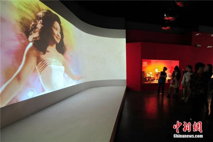 湖北武漢,參觀者在“追夢——鄧麗(li) 君特展”上觀看鄧麗(li) 君的紀錄片。張暢 攝
