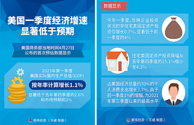 近日,美國商務部經濟分析局數據顯示,美國2023年一季度GDP年化環比增長1.1%,大幅低於(yu) 市場預期的2%,較去年四季度2.6%的增幅有所回落,已連續兩(liang) 個(ge) 季度放緩。《華爾街日報》網站報道稱,在通貨膨脹仍然高企、利率不斷上升的情況下,美國第一季度經濟增長下滑,增加了人們(men) 對今年晚些時候可能出現經濟衰退的擔憂。