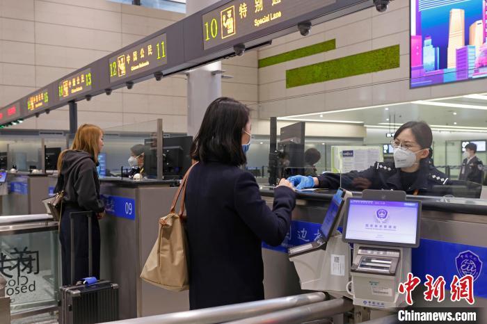 資料圖:虹橋邊檢站民警在對出境旅客進行信息核查。 殷立勤 攝