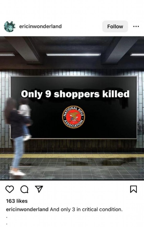 網友Ericinwonderland創作了一則帶有美國步槍協會(hui) 標識的“廣告”,上麵寫(xie) 道:“隻死了9個(ge) 。”