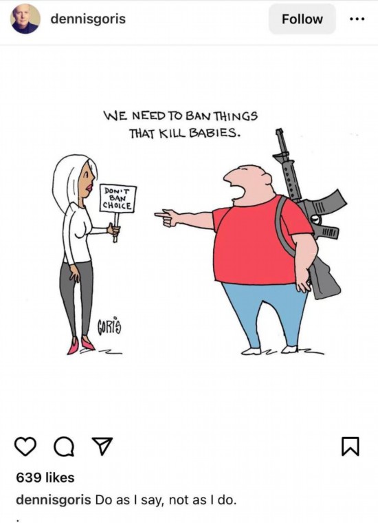 在網友Dennisgoris創作的漫畫中,一名男子指著一名女子說,“我們(men) 要禁止殺死嬰兒(er) 的政策”,卻無視自己背著的步槍。根據美國疾控中心等機構數據,槍支暴力是美國兒(er) 童和青少年死亡首要原因。