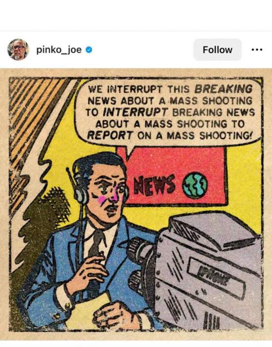 網友Pinko_joe的漫畫主角是一名記者,他對著鏡頭說:“下麵讓我們(men) 打斷一下關(guan) 於(yu) 大規模槍擊的突發報道,臨(lin) 時插播另一條關(guan) 於(yu) 大規模槍擊的突發新聞!”