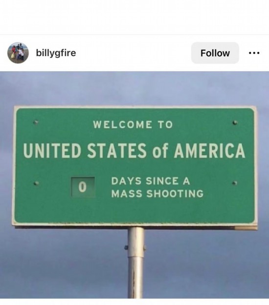 網友Billygfire創作了一塊高速公路廣告牌,上麵寫(xie) 道:“歡迎來到美國,距離上一次大規模槍擊已經過了0天。”