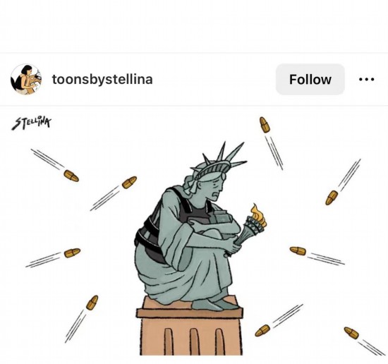 這幅漫畫顯示,麵對來自四麵八方的子彈,身穿防彈衣的自由女神抱著膝蓋瑟瑟發抖。