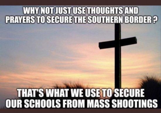 這幅漫畫則諷刺說:“為(wei) 什麽(me) 我們(men) 不隻靠祈禱來阻止非法移民進入美國?我們(men) 可是隻靠祈禱來保護學校不發生大規模槍擊。”