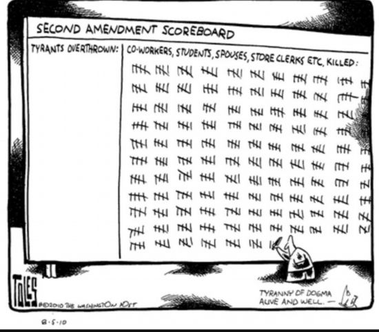 這幅漫畫題為(wei) 《第二修正案“得分板”》,右邊顯示因為(wei) 第二修正案死亡的同事、學生、配偶、商店售貨員等各色人等。美國憲法第二修正案是美國公民擁槍的主要法律依據。