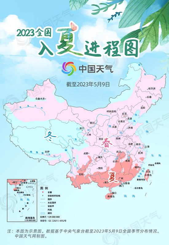 總體(ti) 來看,今年入夏進程相比常年略偏早。據中國天氣網氣象分析師石妍介紹,截至5月9日,我國華南大部、雲(yun) 南大部、湖南東(dong) 部、江西大部、湖北東(dong) 南部以及重慶部分地區已進入氣象學意義(yi) 上的夏季。除了新疆局地、內(nei) 蒙古東(dong) 部、青海和西藏高海拔地區還處於(yu) 冬季,其他地區都處於(yu) 春季。