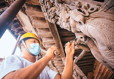 2022年,在國家文物局的指導下,中國文化遺產(chan) 研究院援助尼泊爾工作隊經過近5年努力,圓滿完成尼泊爾加德滿都杜巴廣場九層神廟建築群文物本體(ti) 維修。圖為(wei) 2022年7月,工人在尼泊爾加德滿都進行九層神廟建築群修複工作。