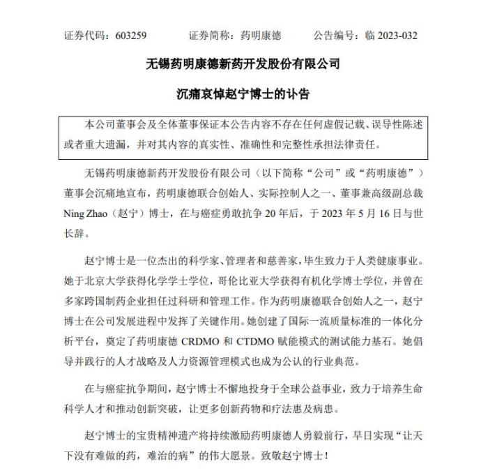 藥明康德發布的訃告稱,趙寧在與(yu) 癌症勇敢抗爭(zheng) 20年後,於(yu) 2023年5月16日與(yu) 世長辭。