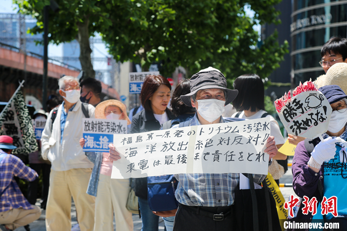 5月16日,日本民眾(zhong) 在東(dong) 京電力公司總部前舉(ju) 行集會(hui) ,表達對日本政府和東(dong) 京電力公司持續強推福島核汙染水排海計劃的強烈反對。 中新社發 蔣文月 攝