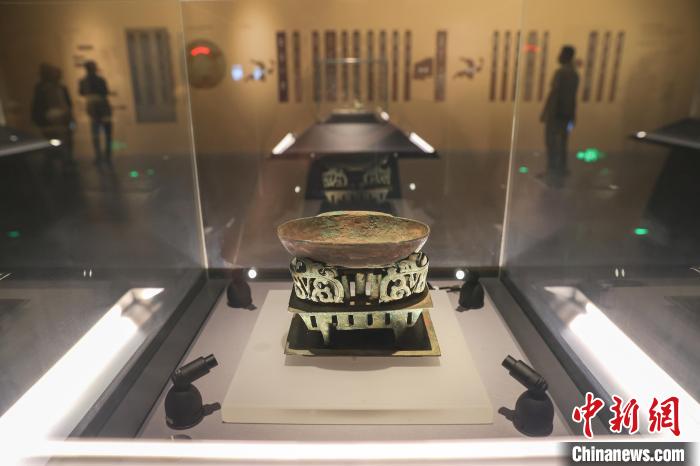 與(yu) 青銅溫鼎相配套的青銅染爐,宴飲時一人一套,隨吃隨“染”。 中新社記者 劉力鑫 攝