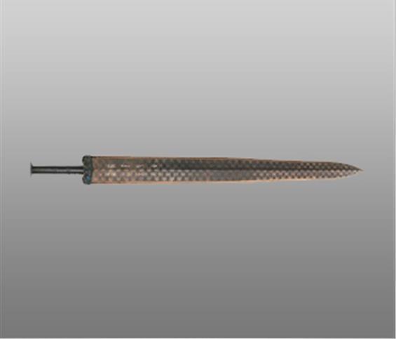越王勾踐劍天下聞名。劍身中脊起棱,飾黑色菱形花紋。劍格正麵嵌藍色琉璃,背麵綠鬆石。曆經兩(liang) 千餘(yu) 年,紋飾仍然清晰精美、劍身鋒利無比。
