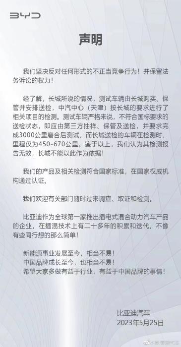 25日,長城汽車發布聲明稱,4月11日向生態環境部、國家市場監督管理總局、工業(ye) 和信息化部遞交舉(ju) 報材料,舉(ju) 報比亞(ya) 迪秦PLUS DM-i、宋PLUS DM-i采用常壓油箱,涉嫌整車蒸發汙染物排放不達標的問題。
