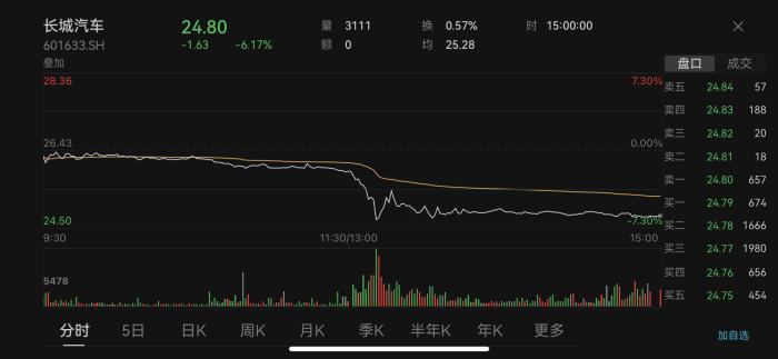 25日盤中,長城汽車一度跌超7%,比亞(ya) 迪跌超2%。截至收盤,長城汽車股價(jia) 報24.80元,下跌6.17%。比亞(ya) 迪股價(jia) 報255.60元,下跌2.41%。汽車整車板塊則下跌0.85%。有股民留言,“最慘的是同時擁有重倉(cang) 長城汽車和比亞(ya) 迪的股民,例如我,太慘了。”