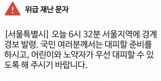 “今天6時32分首爾地區發布警戒警報。請各位國民做好躲避準備,讓兒(er) 童和老弱者優(you) 先躲避。”當天清晨,首爾市民收到這條危急災害通知,手機同時響起警笛聲。