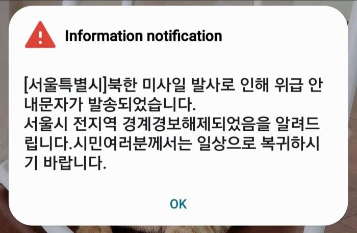 7時26分左右,首爾市再次發布通知稱,“由於(yu) 朝鮮發射導彈,發送了危急災害通知。在此通知,首爾市整個(ge) 地區的警戒警報已經解除。希望各位市民回到日常生活中去。”