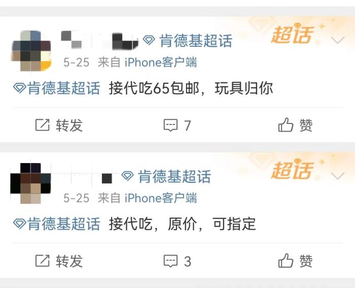 在社交平台裏,能看到不少網友表示,“找代吃”“接代吃”。“接代吃”規則一般有兩(liang) 種,一種是“訂單費用對方付,玩具歸對方,餐食歸自己”;另一種是明碼標價(jia) ,如,“接代吃65包郵,玩具歸你。”