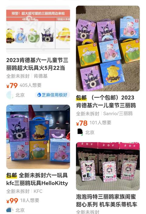 在某二手平台,肯德基此次發售的三麗(li) 鷗玩具,標價(jia) 集中在70元至100元之間,比69.9元的兒(er) 童節套餐價(jia) 格更貴。麥當勞俄羅斯方塊遊戲機的價(jia) 格多在40元至60元之間。