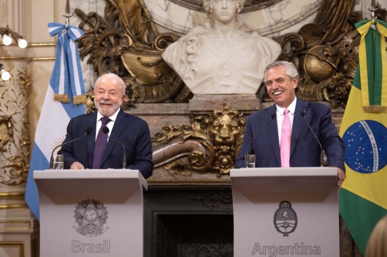 1月23日,在阿根廷布宜諾斯艾利斯,阿根廷總統費爾南德斯(右)和巴西總統盧拉在玫瑰宮出席新聞發布會(hui) 。新華社發(馬丁·薩巴拉攝)
