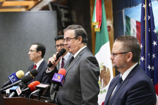 2019年8月5日,在美國得克薩斯州埃爾帕索的墨西哥駐埃爾帕索領事館,墨西哥外長埃布拉德(左三)在記者會(hui) 上講話。新華社記者王迎攝