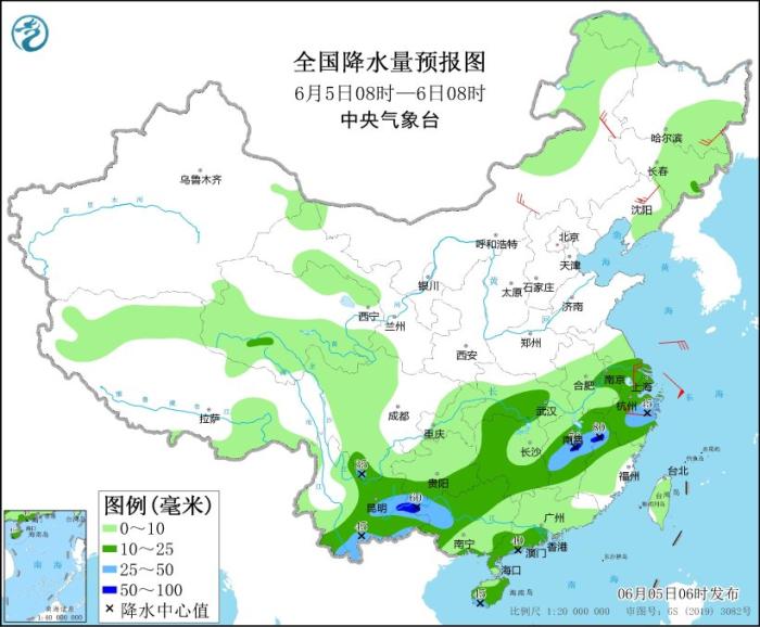 圖1 全國降水量預報圖(6月5日08時-6日08時)