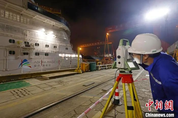 6月1日淩晨2時,中國首艘國產(chan) 大型郵輪“愛達·魔都號”開始注水起浮,工作人員對船體(ti) 相關(guan) 數據進行檢測。殷立勤 攝